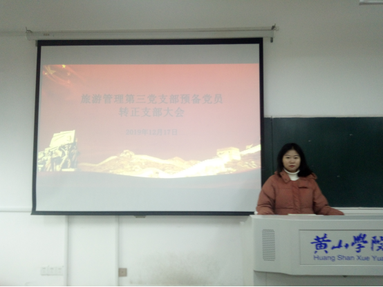 2019年12月17日,旅游管理第三党支部召开了预备党员转正支部大会,本次会议由旅游管理第三党支部书记张俊香老师主持,外出实习同志胡昌伟、郁子言两位同学以视频连线的方式参加,支部全体党员均参与了此次会议。