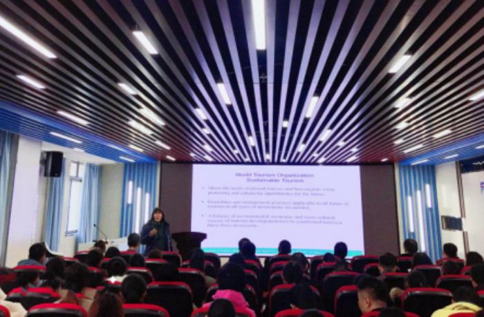 Linda 博士主要介绍了她在旅游业可持续发展——生态旅游领域多年来的研究成果。她从生态旅游的界定、特征,发展生态旅游的措施,以及新时代如何构建生态旅游质量监督检验指标体系等内容,全方位向旅游学院师生展示生态旅游最前沿的科研成果及趋势。然后,Linda 博士和与会师生进行了热烈的交流和互动。最后,该院副院长金声琅教授作了总结发言,并表达了对Linda 博士的感谢和后期继续合作交流的殷切期望。