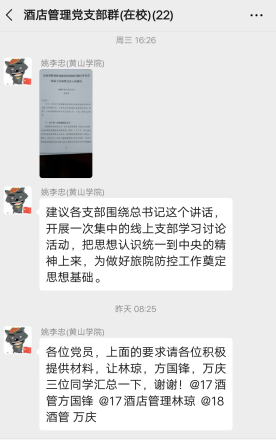 为贯彻落实习总书记关于疫情防控工作的重要指示和讲话精神,发挥党员作用,3月5日下午18酒店管理党支部通过微信会议学习习总书记关于疫情防控工作的重要指示和讲话精神。讨论党员应该如何加强理论学习,发挥党员作用相关问题。