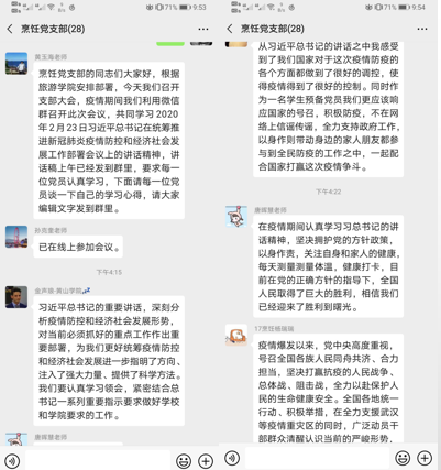 2020年3月6日下午16点,在战“疫的特殊时期,烹饪党支部利用微信召开了党支部大会。本次支部大会采用党员线上互相沟通交流的形式举办,会议由党支部书记黄玉海老师主持,党支部全体党员、预备党员参加。