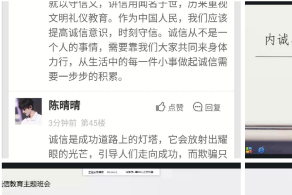 在此次会议中,我班学委黄缓缓从以下四个方面展开,分别是:关于国家助学贷款的那些事儿、典型案例、违约后果,以及提出呼吁。此次会议让同学们细致的了解到国家助学贷款的形成背景,同时,也向同学们讲述了社会中不按时缴纳助学贷款的真实案例以及后果,并呼吁大家一定要内诚于心,外诚于人,不做有违道德原则和规范的事。对此,同学们纷纷在由易班班长廖圣强提供的轻应用平台上表达自己的观点,立志坚守中华民族优良的传统美德,做到诚信对人,诚信对己。