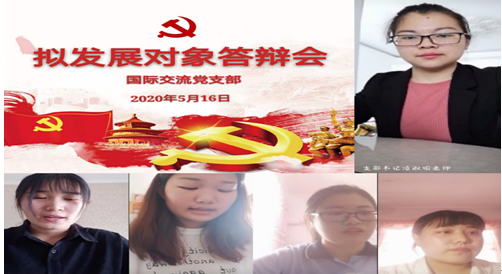 大会伊始,凌淑瑜老师介绍了本次答辩会的主要议程和会议要求,随后欧巧雨、樊思佳、刘梦淇等入党积极分子从入党动机、思想道德政治情况、学业成绩、志愿活动及综合表现方面进行了自我陈述,详细地汇报了本人在校期间的情况,表达了强烈的入党意愿。自我陈述后,凌淑瑜老师了解了入党积极分子培养考察期间的思想政治表现,最后经过支委会成员讨论,宣布吴琴、欧巧雨、樊思佳、王子英、刘梦淇五位同学为2020年上半年国际交流党支部党员发展对象。