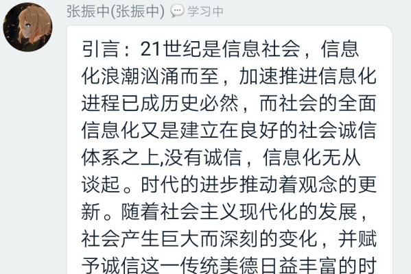 班会中班长先是举了三个关于诚信的例子,让班级同学看完后发表感想。班级同学看完后积极发言,表达自己对三则诚信例子与个人诚信的想法。此次“诚信资助教育”线上主题班会意在使同学们认识到诚信的重要性和培养同学们诚信的意识,并初步学会将诚信融入日常生活中的每一件小事, 真正做到诚实守信。让每位同学认识到诚信对于人生的重要性,诚信是做人的一种品质,是职业道德的根本,是个人成就事业的根基。要培养诚信的良好道德品质,就要从身边的每一件小事做起。作为当代大学生,我们应该做到诚实,诚恳, 实事求是,重信用,守承诺,做一个一诺千金的人。