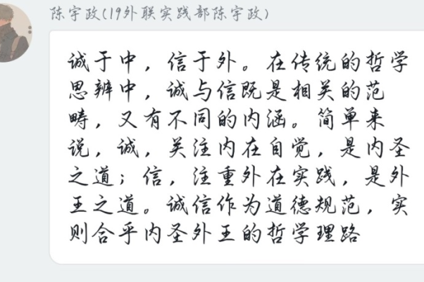 总而言之,每个人对诚信的理解均不相同,但相信我们的同学都是讲诚信之人,在平日的一言一行中都会展现出诚信的一面。