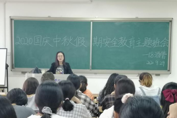 为落实学校国庆中秋假期期间的学生管理和安全稳定工作的要求和措施,18酒管班于9月29日,在文思楼71007教室召开了“国庆中秋假期安全教育”主题班会。此次班会由辅导员刘念老师主持,18酒管班全体学生参会。